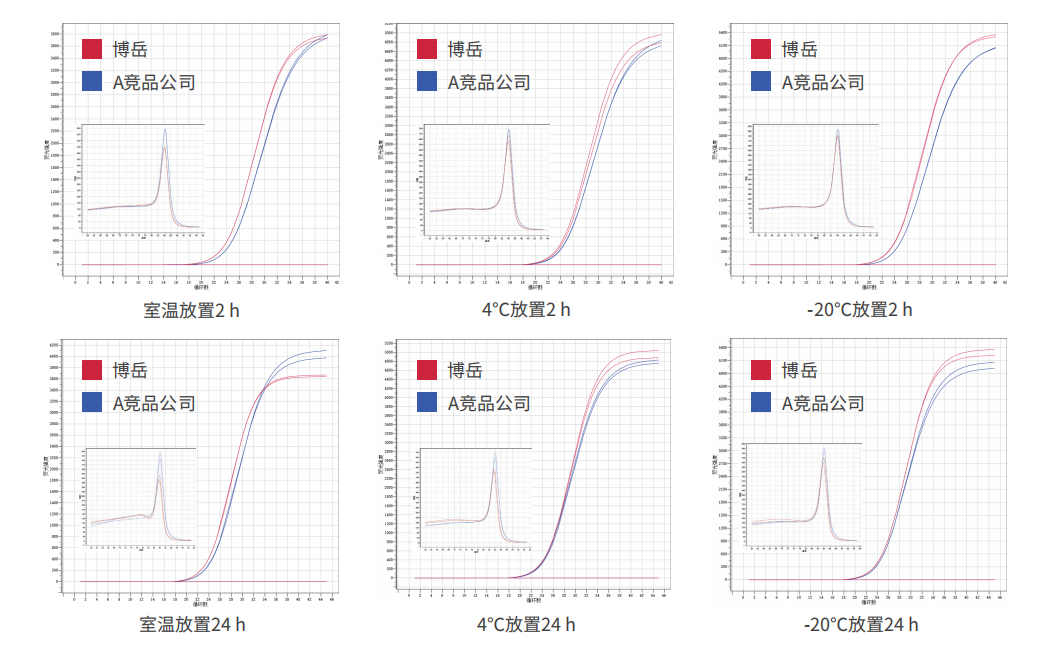 与主流品牌A公司的竞品进行对比,分别在室温、4℃、-20℃条件下孵育2 h和24 h,结果显示,博岳产品Ct值领先,熔解曲线呈单一尖锐峰,无非特异性荧光产生,此时定量准确,表明扩增产物产量更高,酶活性更好,无非特异性扩增。